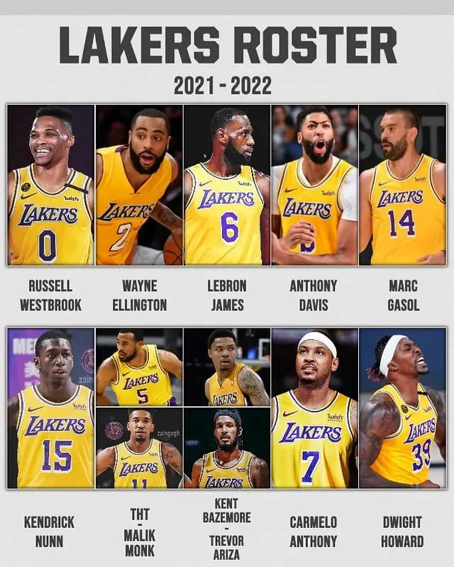 湖人阵容2022. 洛杉矶 湖人 在2021年休赛季也是进行了一系列迷惑性的补强操作拿下 威少 补强后卫线的冲击力的确不错可是连续拿下霍华德安东尼隆多阿里扎的操作也是让球迷网友们觉得云里雾里的毕竟老将容易受伤病困扰也是容易让湖人在漫长的赛季中遭受毁灭性的打击. 新赛季湖人队员名单 湖人队 阵容 平均年龄28岁 平均身高202米 平均体重1025公斤 号码 球员 位置 身高 体重 年龄 生日 nba球龄 2 德里克-费舍尔 控球后卫 185米 93公斤 35岁 1974-8-9 13年 4 卢克-沃顿 小前锋 203米 105公斤 29岁 1980-3-28 6年 5 乔丹-. 湖人2021-22赛季的大名单卡梅罗-安东尼特雷弗-阿里扎乔尔-阿伊肯特-巴泽摩尔桑 迪-布朗 帝位-卡考克安东尼-戴维斯韦恩-艾灵顿塔伦霍顿-塔克德怀特-霍华德勒布朗- 詹姆斯 德 安德鲁 乔丹 韦斯利 - 马修斯 迈克-麦克兰 马利 克-蒙克肯德里克-纳恩等.